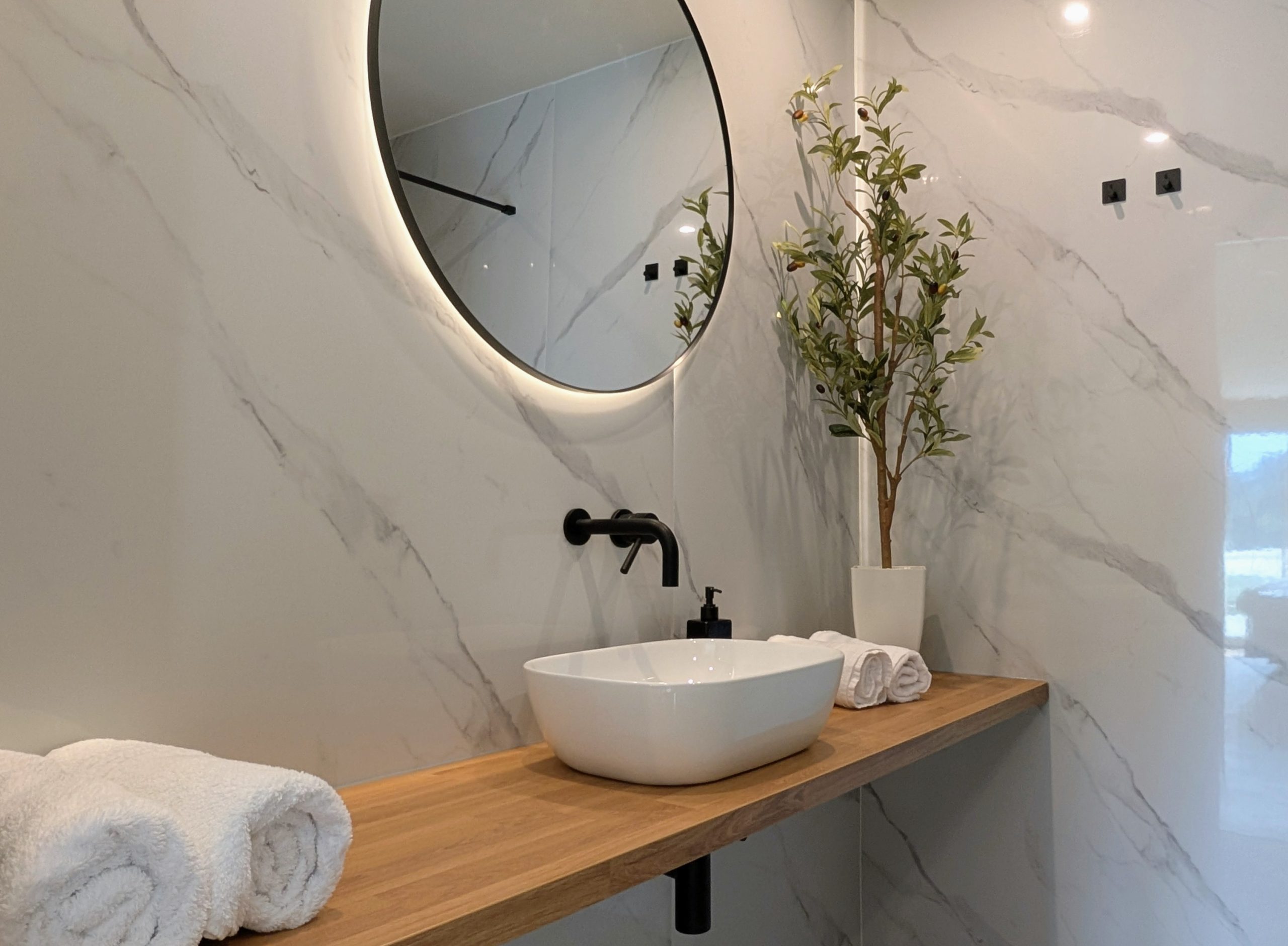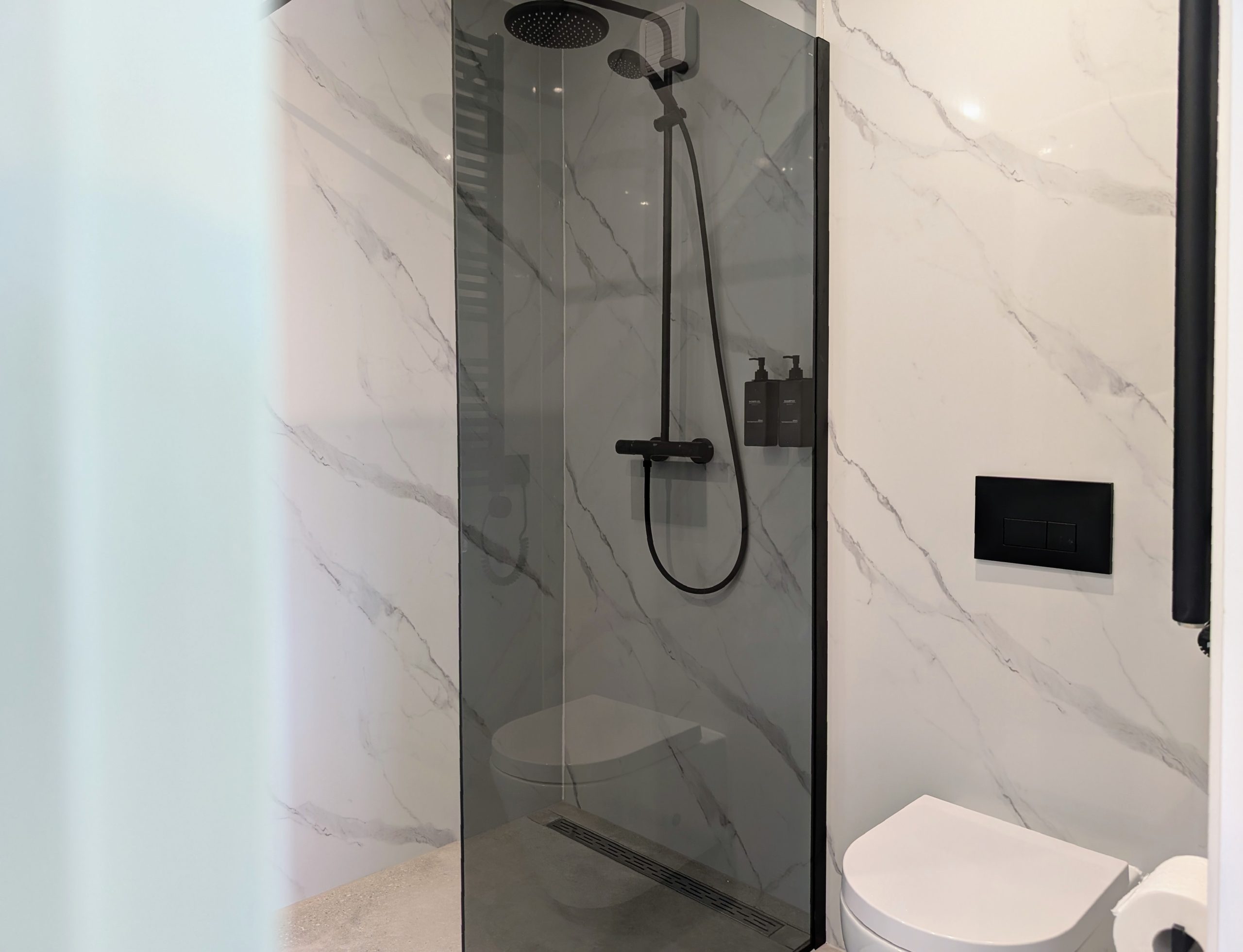 De ruime badkamer is voorzien van een inloopdouche met regendouche, een toilet en moderne waskom.